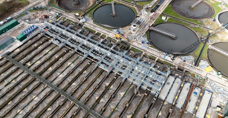 The AJE scope was to design, detail, fabricate, supply and install a new steel framework 134m long x 26m wide over the existing sludge plant lanes at the wastewater treatment works. The new structure also incorporates raised walkways running the full length, consisting of a primary walkway with bridge support frames for mechanical installation and two tertiary walkways. There are a further 12 walkways spanning the width.
