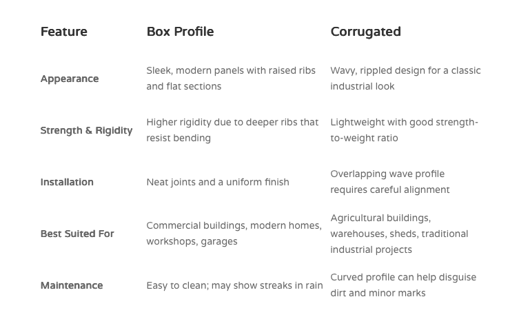 Box profile sheets offer a modern, clean finish with high structural strength, while corrugated sheets provide a traditional appearance with reliable durability and effective water run-off