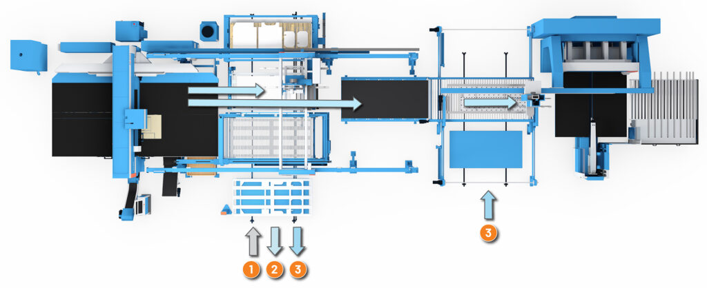 Take the example of integrating a punch-shear combination machine alongside a punch-laser machine. In a non-modular environment, these might run independently. However, in an integrated, modular workflow, we can optimize production based on strengths.