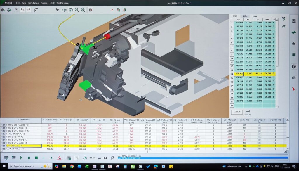 The machine supplier’s off-line VGP3D software simplifies operation of all three electric tube bending machines. On receipt of a customer order and component drawing, Mr Thorpe simulates the bending sequence on-screen to detect any potential collisions or other problems. If issues are encountered, they are discussed with the customer and design changes – another key facet of the Olicana offering – are proposed before the program is finalised.